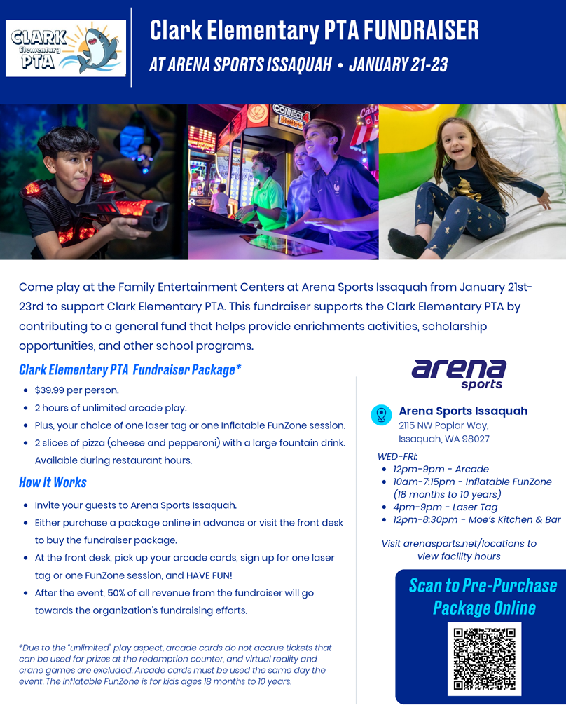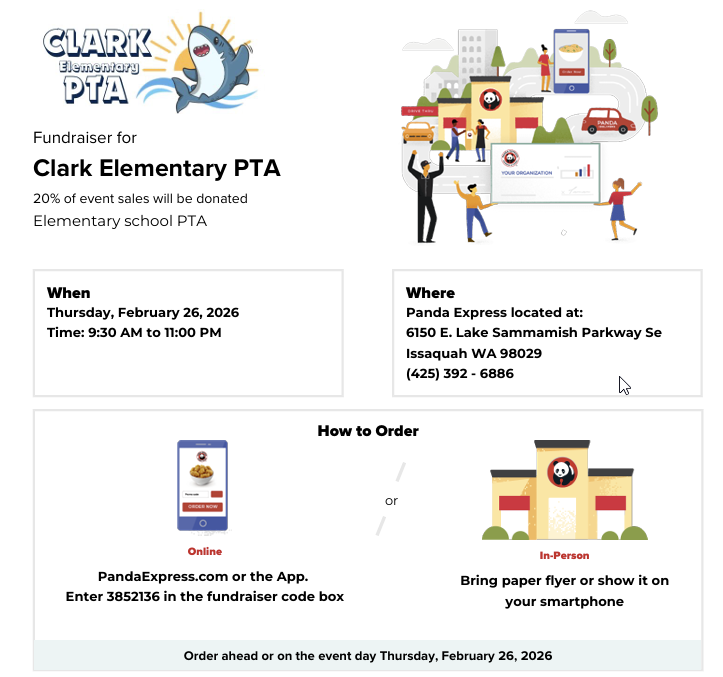 On December 3rd from 4-8pm, order some delicious Chipotle and earn money for Clark! ![]() Bring in this flyer to the Gilman Blvd Chipotle or order online through the Chipotle app or website and use fundraiser code: MFPQBC3Y and Chipotle will donate 25% of your bill to Clark Elementary! |